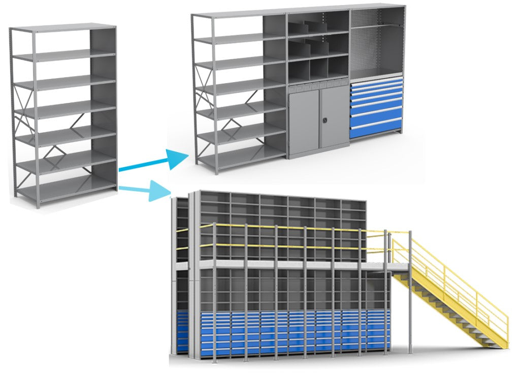 Les baies d’étagères Interlok peuvent être combinées pour créer un système de rangement à paliers multiples semblables aux mezzanines et aux zones de rangement surélevées. Une multitude d’accessoires sont disponibles et peuvent être ajoutés aux étagères Interlok. Les systèmes a paliers multiples sont idéals pour:
